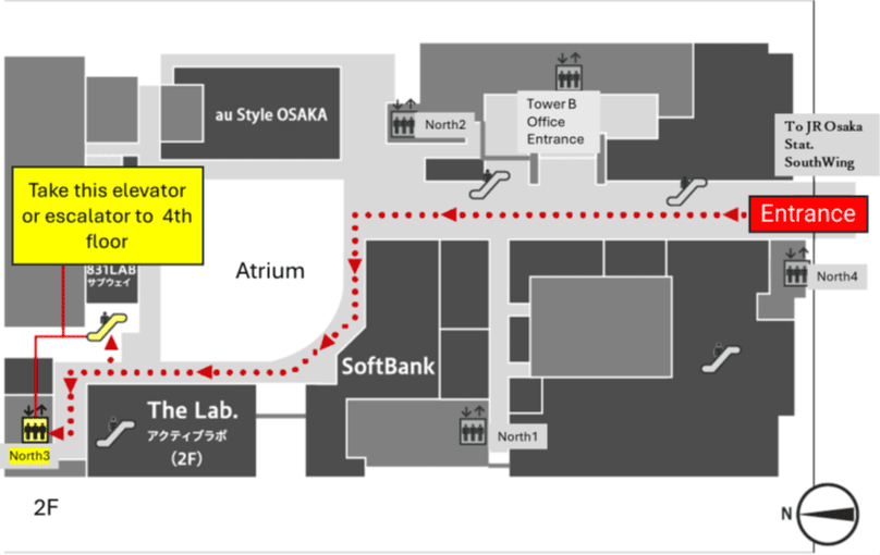 - Enter the North Building and proceed to Tower C and take the escalator or elevator (North 3) to the 4th floor.