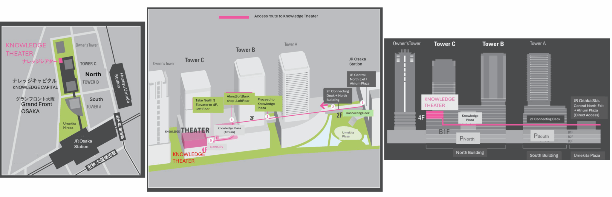 Path/routes from Osaka/Umeda station to KNOWLEGE THEATER Entrance on the 4th floor, Tower C
