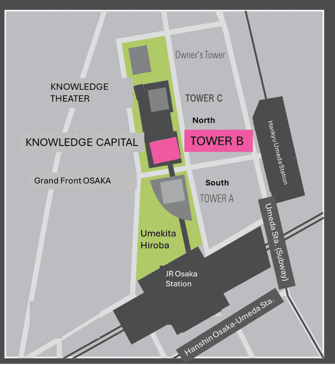- Route: Osaka Station -> North Building (Grand Front Osaka) -> Tower C. 2F -> The knowledge Theater Entrance (Tower C) ->Venue 2(4F), Venue 3 (5F), Venue 4 (6F)